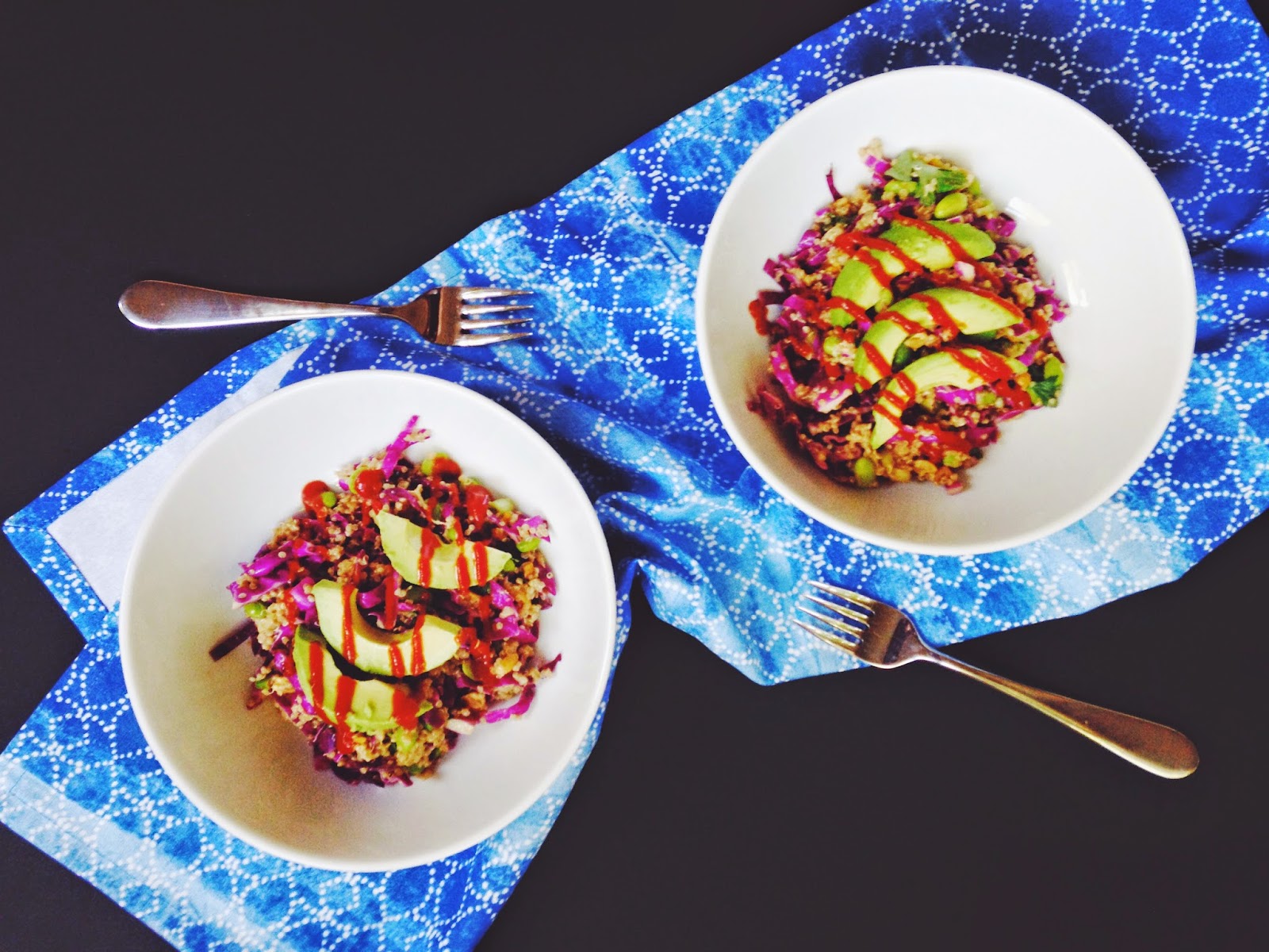 Serve in bowls with slices of avocado on top and drizzled with as much sriracha as you like.
