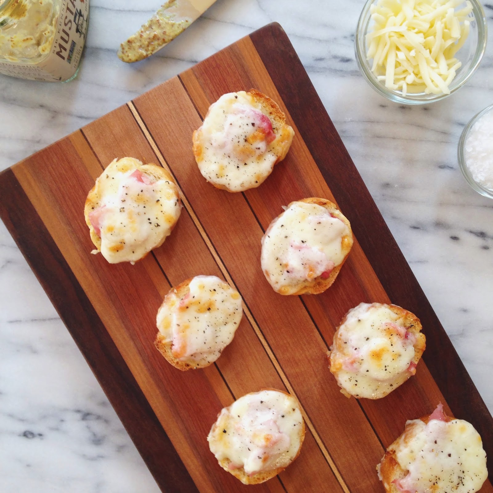 Top each slice of baguette with mustard and top with a bit of ham to each. Next, spoon on a bit of the cheese sauce, then sprinkle with Gruyere. Bake for 5 minutes. Turn on the broiler and broil for 3 to 5 minutes, or until the topping is bubbly and lightly browned. Top with a grind of black pepper, and serve hot.